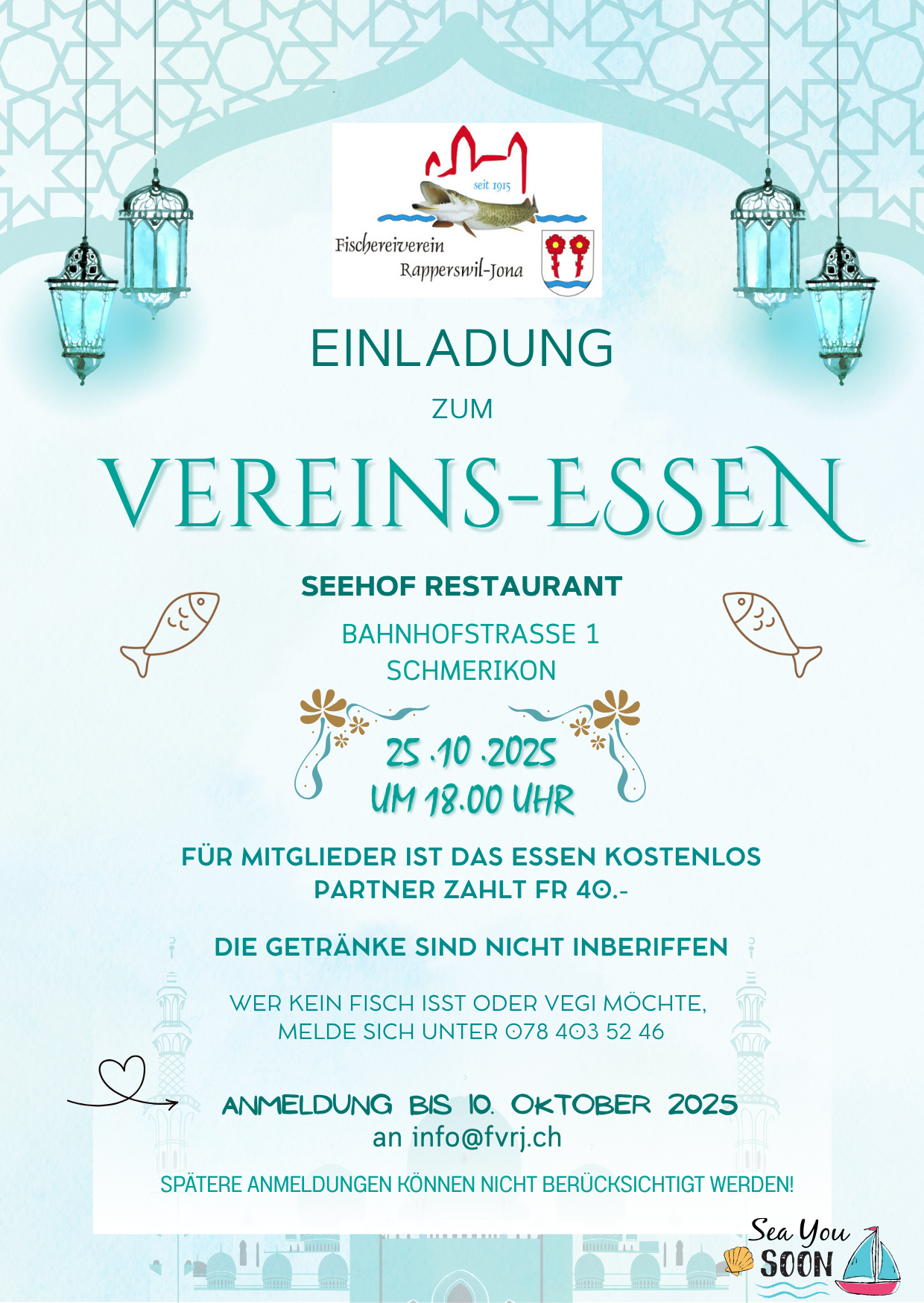 Wir laden Euch herzlich zu unserem Vereins-Essen am 25. Oktober 2025 in Schmerikon ein.